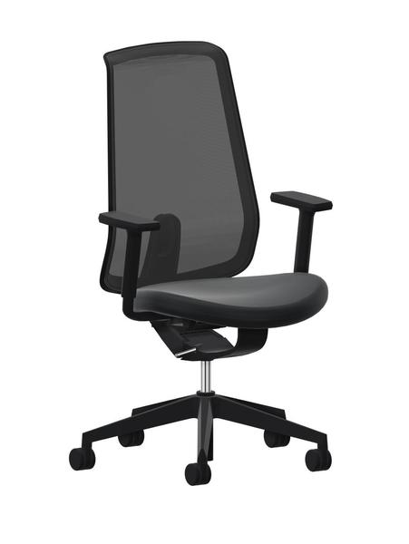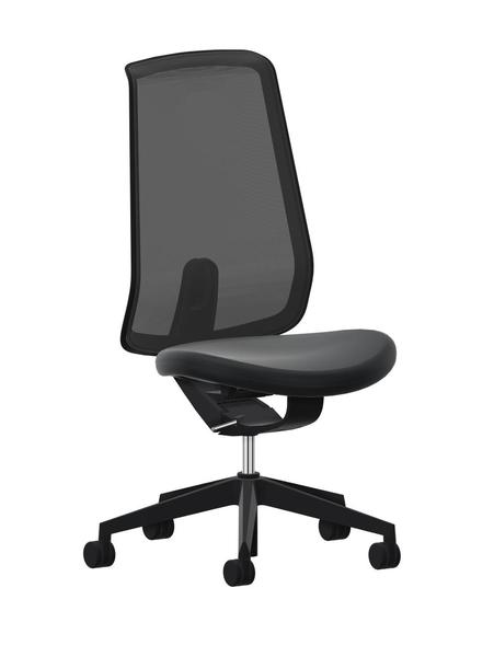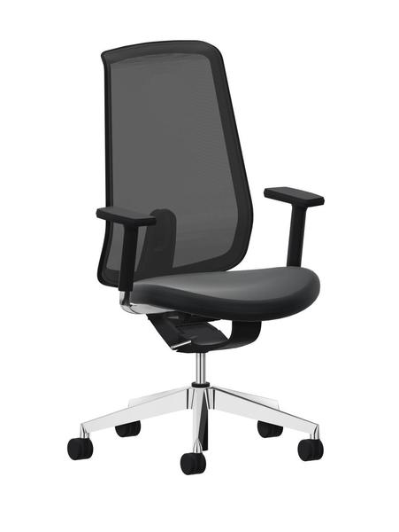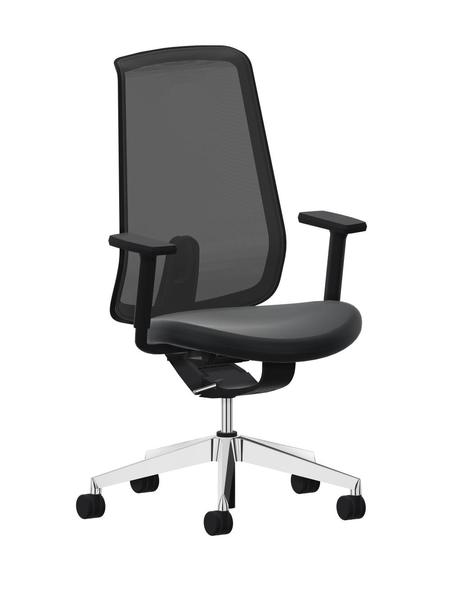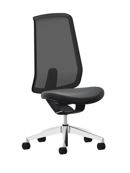 Drehkreuz wahlweise in Kunststoff schwarz oder Aluminium poliert. Lastabhängig gebremste Doppelrollen Ø 60 mm wahlweise mit harter Lauffläche für textile Böden oder weicher Lauffläche für harte Böden. Bedienelement und Armlehnen Kunststoff schwarz. Rahmenkonstruktion der Rückenlehne Polyamid schwarz. Sitz gepolstert, Stoff radio schwarz S3140. Rückenlehne mit Netzbespannung schwarz 207 (Lehnen-Rückseite Netzbespannung schwarz).