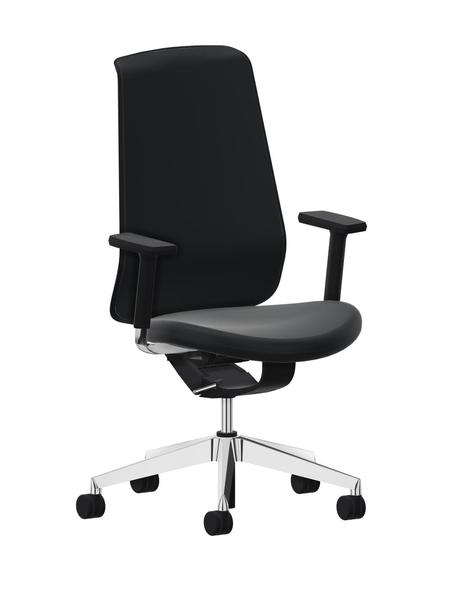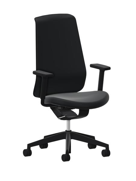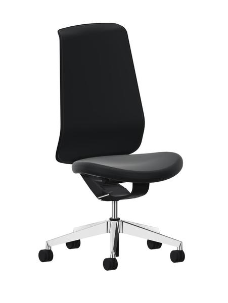Drehkreuz wahlweise in Kunststoff schwarz oder Aluminium poliert. Lastabhängig gebremste Doppelrollen Ø 60 mm wahlweise mit harter Lauffläche für textile Böden oder weicher Lauffläche für harte Böden. Bedienelement und Armlehnen Kunststoff schwarz. Rahmenkonstruktion der Rückenlehne Polyamid schwarz. Sitz und Rückenlehnen-Vorderseite gepolstert, Stoff radio schwarz S3140, Lehnen-Rückseite Netzbespannung schwarz.